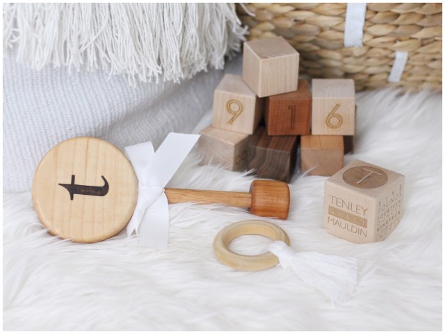 Isn’t the initial rattle so pretty?! It came perfectly packaged too! This would be a great baby shower gift for any new mama. The number blocks are great for displaying her birthday in the nursery or for playing with during tummy time. Tenley has been showing signs of teething so she’s loved hanging on to the tassel teether lately. How perfect is the personalized wooden block? I love that it has her birthday, weight, time of birth, etc. all on it.