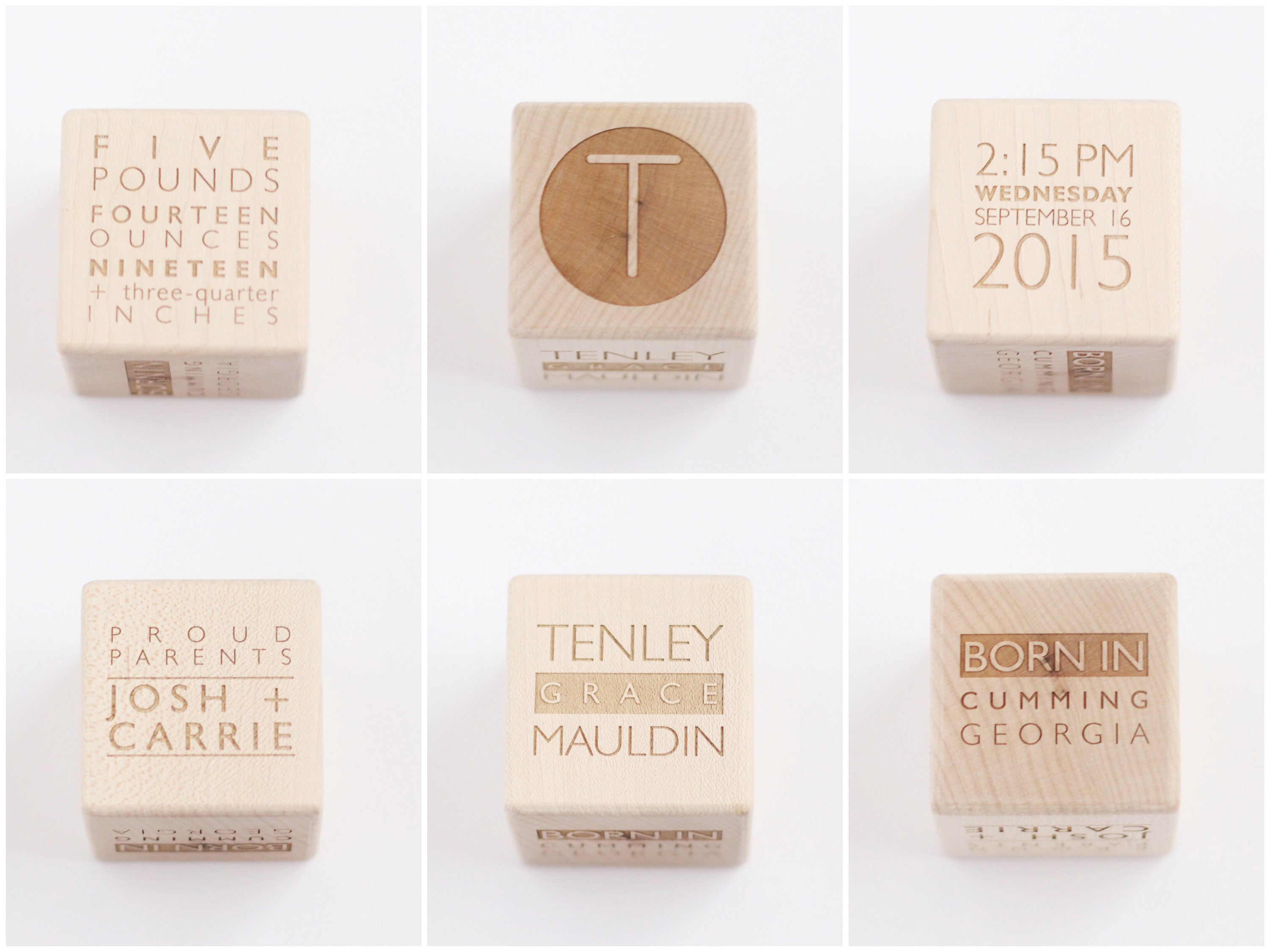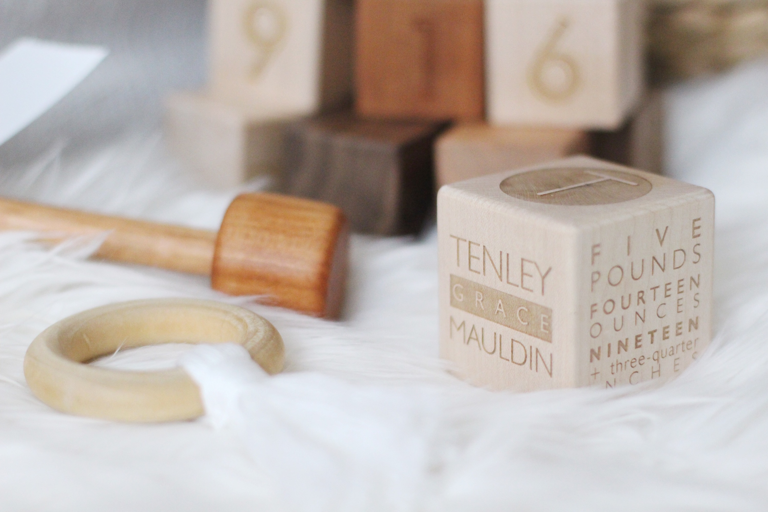 Isn’t the initial rattle so pretty?! It came perfectly packaged too! This would be a great baby shower gift for any new mama. The number blocks are great for displaying her birthday in the nursery or for playing with during tummy time. Tenley has been showing signs of teething so she’s loved hanging on to the tassel teether lately. How perfect is the personalized wooden block? I love that it has her birthday, weight, time of birth, etc. all on it.