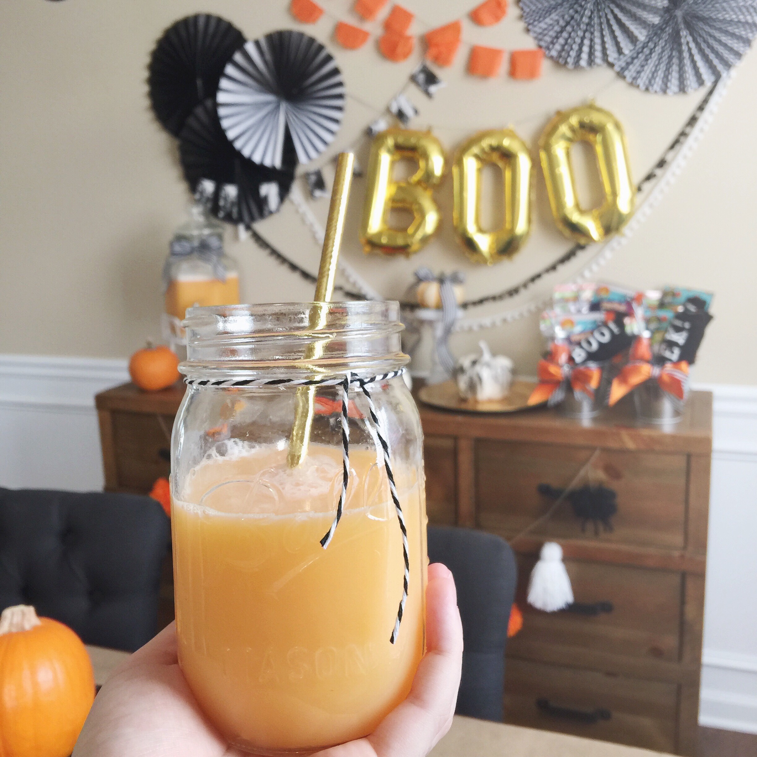 I invited a couple mommy friends over today and we attempted to have a pumpkin painting party with our little ones…. keyword “attempted.” Not many pumpkins were painted, but a lot of fun was had! We enjoyed a yummy orange punch, apple cider, chicken pot pie, and chocolate fondue! All the kids got their own little bucket filled with Halloween stickers, a Halloween coloring book (thank you dollar section at Target), bubbles, snacks, and a t-shirt I made that either said “EEK!” or “BOO!”…. I may have made one for myself as well haha). I sliced up apples and found a recipe for slow cooker chocolate fondue for us to dip them into. We had six selections of topping too: mini marshmallows, mini m&ms, crushed pretzels, crushed graham crackers, nuts, and toffee. I forgot to take photos of it with my camera so I’ve included a photo from my phone below. Find the orange punch recipe at the end of this post! xoxo, Carrie